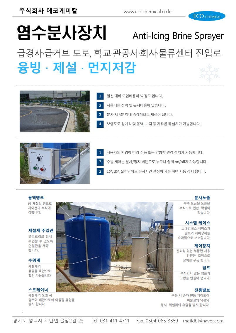 ÀÌ ÀåÄ¡´Â ¿°¼ö(¼Ò±Ý¹°)¸¦ µµ·Î Ç¥¸é¿¡ ºÐ»çÇÏ¿© ´«°ú ¾óÀ½À» ³ìÀÌ°í µµ·ÎÀÇ °áºùÀ» ¹æÁöÇÏ´Â ¿ªÇÒÀ» ÇÕ´Ï´Ù.
